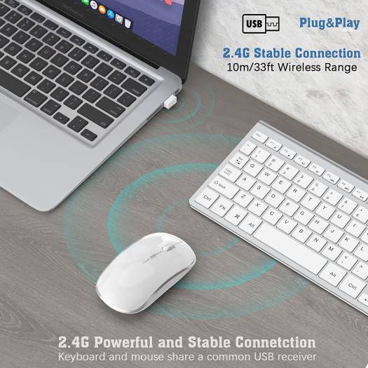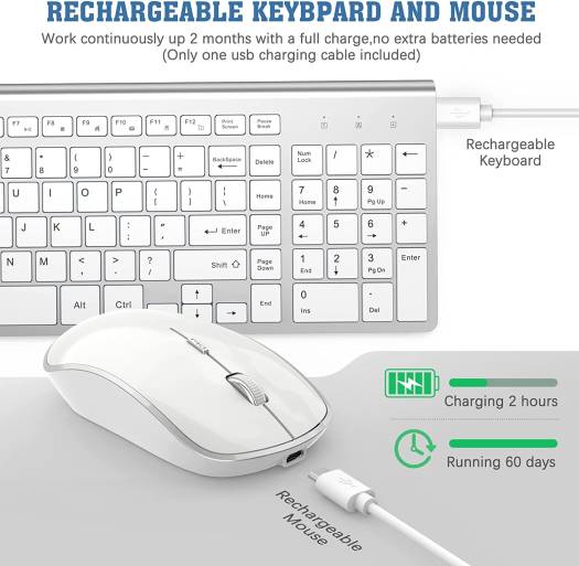 Rechargeable recyclable batteries J JOYACCESS Wireless Keyboard and Mouse are built-in 500 mAH Li-ion batteries;one full recharge provide more than 120 hours work.And the keyboard and mouse will automatically come into intellegent sleep mode if no activities in 20s;which ensure high power efficiency and long battery life.No need to replace or dispose Alkaline batteries any more 2.4G Plug and Play Wireless keyboard mouse combo are adapted with enhanced 2.4G chipset for dropout-free connection,makes sure stable connection and long working distance of up to 33ft without any delays.keyboard and mouse can be both connected with one USB Receiver. Support plug and play, no need to any drive, widely compatible with Windows/7/8/10+Mac os, which are greatly easy and convenient to use Less noisy ergonomic design Design advanced scissor switch keys for keyboard, and quiet clicks for mouse, helping reduce noise interference, no more worries about affecting others.lightweight and skin-friendly design for the mouse, which all meet ergonomic design, can bring comfortable and smooth feeling