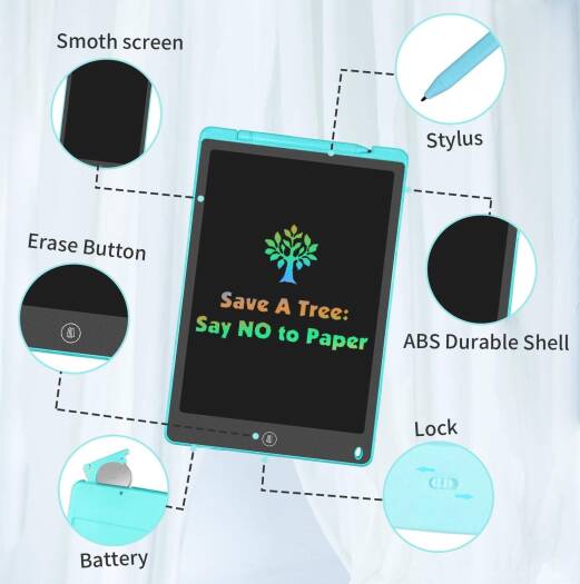 Safety And High-Tech Colourful Screen:This Writing tablet adopts advanced 12-inch LCD colourful screen,no radiation and safe to use. Colourful screen, larger size and brighter color, which can let your children display their incomparable imagination.Enjoy it!