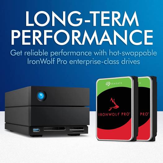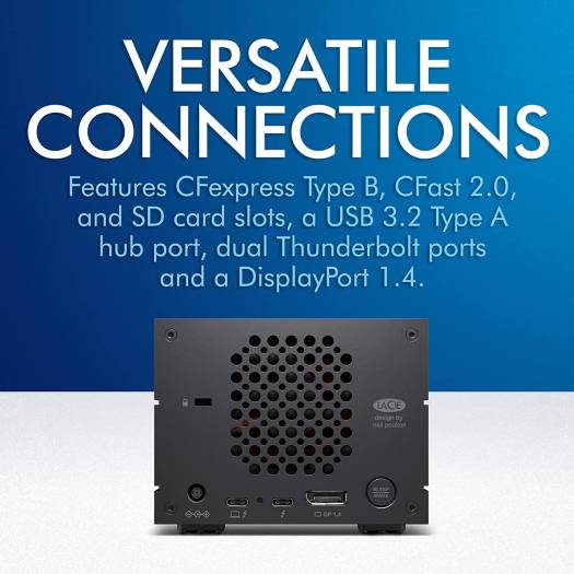 If you’ve been looking for a powerful and versatile Thunderbolt 3 docking station that restores many of the ports and connectivity that have been removed on modern day laptops, take a look at the 20TB 2big Dock 2-Bay Thunderbolt 3 RAID Array from LaCie. The 2big Thunderbolt 3 Dock delivers a storage capacity of 20TB, which is comprised of two 10TB Seagate IronWolf Pro 7200 rpm SATA III 3.5″ enterprise-class hard drives. While the 2big is compatible with Windows 10 and macOS 10.12, it comes formatted as HFS+ for Mac, and is configured as hardware-controlled RAID 0, which provides performance gains, but no data redundancy. Also supported is RAID 1 and JBOD. 16TB Capacity (2 x 8TB Hard Drives) 2 x Thunderbolt 3 1 x USB Type-A | 1 x DisplayPort 1.4 CompactFlash | CFast 2.0 | SD Card Supports RAID 0, 1, and JBOD