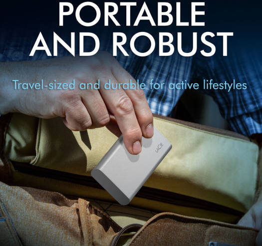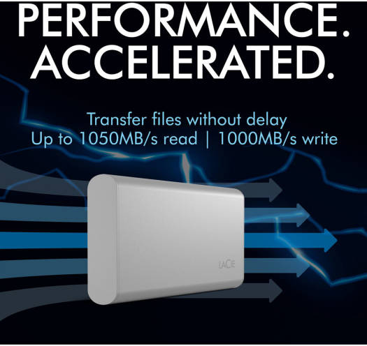 Style That Performs. Performance That Endures. Experience fast editing, backups, and transfers with full-throttle read speed of up to 1,050 MB/s and write speed of up to 1,000 MB/s. Store high-res source files, images and video. And enjoy universal compatibility across Mac ® , Windows ® , and iPad ® devices with USB-C. LaCie Portable SSD is more than a compact external solid state drive. It’s reliable, forward momentum in every possible way. Sizzling Speeds Won’t Hold You Back Create content and collaborate confidently with fast SSD speeds comparable to NVMe (actual data rates may vary depending on operating environment and other factors, such as chosen interface and disk capacity). Edit straight from your external drive with read speeds of up to 1,050 MB/s and write speeds up to 1,000 MB/s Transfer an hour of footage in less than a minute Edit multiple streams of 4K video