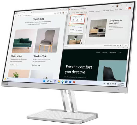 L27e-40 27″ Monitor Lenovo’s L27e-40 Monitor is primed for productivity and crafted to entertain. Don’t miss a thing on excel sheets and other work documents on the expansive 27″ FHD screen. With its wide viewing angles, the VA panel lets you easily collaborate with colleagues or enjoy movies with your friends and family. The 3-side NearEdgeless display design means that you get a lot more screen real estate packaged into a smaller form factor when compared to traditional 27″ monitors. Key Features Display Size: 27 inches Resolution: FHD (1920 x 1080) Panel Type: VA (Vertical Alignment) Aspect Ratio: 16:9 Backlight Type: WLED (White Light Emitting Diode) Response Time: 4ms Refresh Rate: 100 Hz