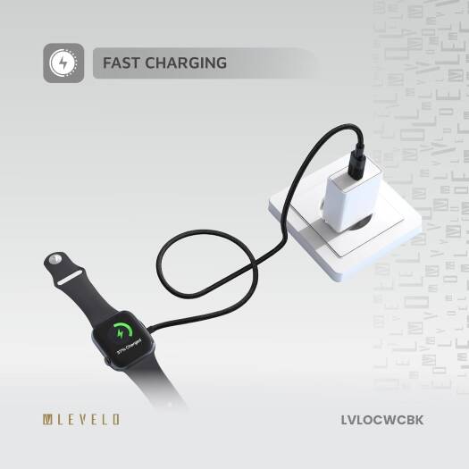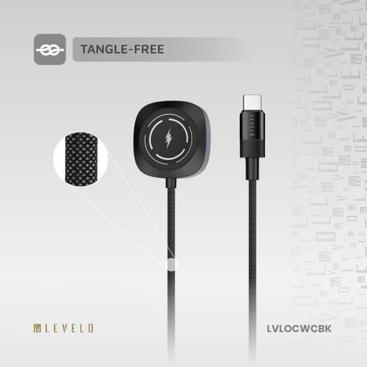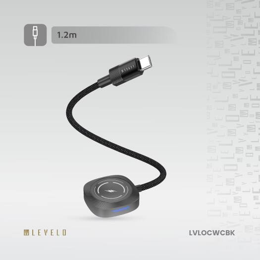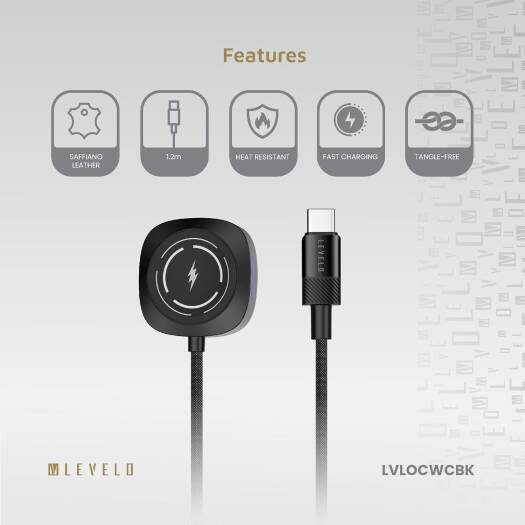 Levelo Otto Type C Compatible With Apple Watch Wireless Charger Cable,Fast Charging,1.2M Cable,Heat Resistant,Tangle-Free,Saffiano Leather,Plug & Charge,Aluminum Alloy & Plastic Shell – Black