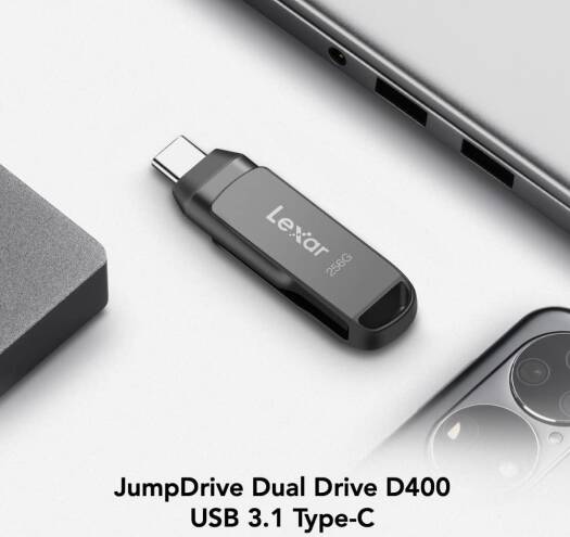 The Lexar JumpDrive Dual Drive D400 USB 3.1 Type-C is a 2-in-1 flash drive that allows you to seamlessly transfer content between your USB Type-C and Type-A devices. Featuring a stylish metal casing and swivel design for added protection, this drive is as tough as it is fast with transfer speeds up to 130MB/s.
