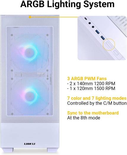 White PC Case – USB Type-C port included. Upgraded mesh front panel enables greater air ventilation yet dust free with magnetic dust filters on the top and bottom. Liquid cooling ready Desktop computer case includes 3 ARGB LED Lighting PWM Fans – 2x140mm front fans and 1x120mm rear fan. 7 color and 7 lighting modes are controlled by the C/M button on the top of the case. Sync to the motherboard at the 8th Mode ATX Case with tempered glass side panel allowing for a great view of your RGB components. Steel front panel/main structure with plenty of room, supports motherboard size of ATX, Micro ATX (mATX) and Mini-ITX Mid-Tower Chassis with ease installation design. Removable SSD mounting brackets, swappable top fan brackets and bottom side panel PSU and HDD bay. Change with no more pain Gaming PC Shell Case with professional cable management solution. Extra space behind the motherboard tray for hidden cable organization. I/O essentials, 2xUSB 3.0 Type-A, 1xUSB Type-C, Power button, C/M button, audio out and in on the top