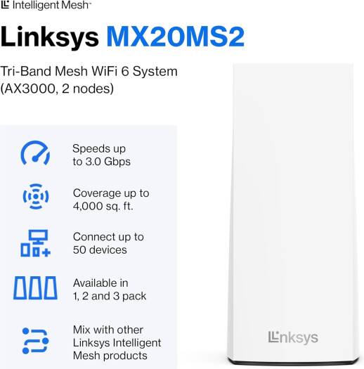 Linksys Atlas WiFi 6 Router Home WiFi Mesh System, Dual-Band, 4,000 Sq. ft Coverage, 50+ Devices, Speeds up to (AX3000) 3.0Gbps – MX2000 2-Pack