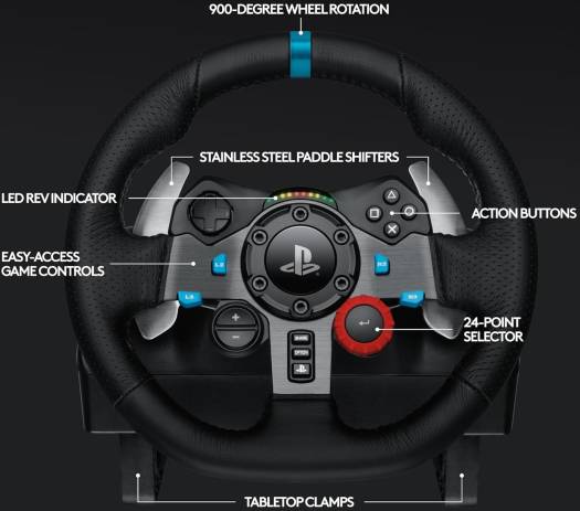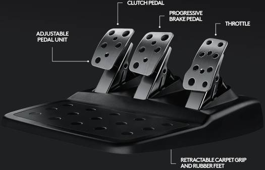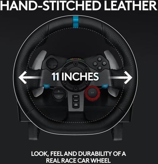 G29 Driving Force Racing Wheel and Floor Pedals Get an immersive racing experience with the Logitech G29 Driving Force Racing Wheel . The G29 features a 10.24″ racing wheel covered with hand-stitched leather. The wheel rotates up to 900° and features dual-motor force feedback for a realistic driving experience. In addition to the wheel, the G29 also comes with a 3-pedal set. The throttle, brake, and clutch pedals allows you to accelerate, brake, and change gears with the feel of an actual car. The nonlinear brake pedal mimics a pressure-sensitive brake system for a more responsive, accurate braking feel. There are also rubber feet for hard surfaces and a patented retractable grip system for carpets.