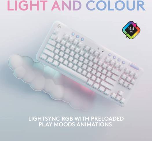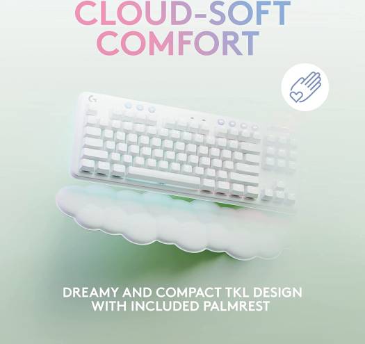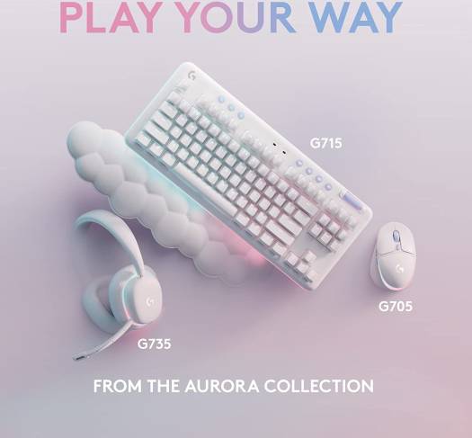 MEET G715 G715 Wireless Gaming Keyboard from the Aurora Collection delivers low-key vibes with high-key performance so you can express yourself and take on new adventures. COMPACT AND STYLE PACKED A compact, tenkeyless footprint with adjustable height makes for comfortable all-day play. Cloud-soft palm rest included to complete your dreamy desktop vibes. MECHANICAL GX SWITCHES Super satisfying mechanical GX switches give advanced performance with a classic feel. Choose tactile, linear, or clicky.