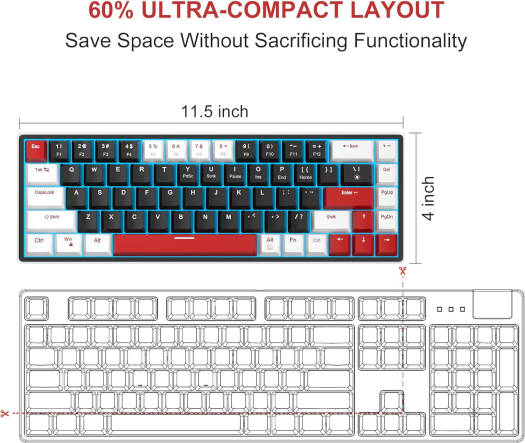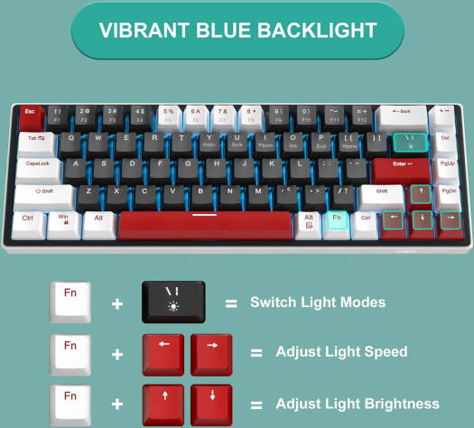 SKY68 SMALL FRAME, BIG PERFORMANCE MageGee SKY68 mechanical gaming keyboard has a 65% compact layout with separate arrow keys and function keys. It performs the commands of a full-size keyboard and saves desktop space. It is easy to carry for its smaller size. COOL BLUE LED BACKLIGHT Luminous blue backlight with a variety of static and dynamic lighting effects, which is more visible in dark environments. Press FN + | to switch the lighting mode, press FN + ⬅ / ➡ to slow down/fasten the lighting flowing speed, and press FN + ⬆ / ⬇ to increase/decrease the lighting brightness. HOT-SWAPPA