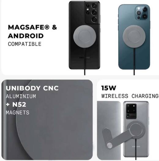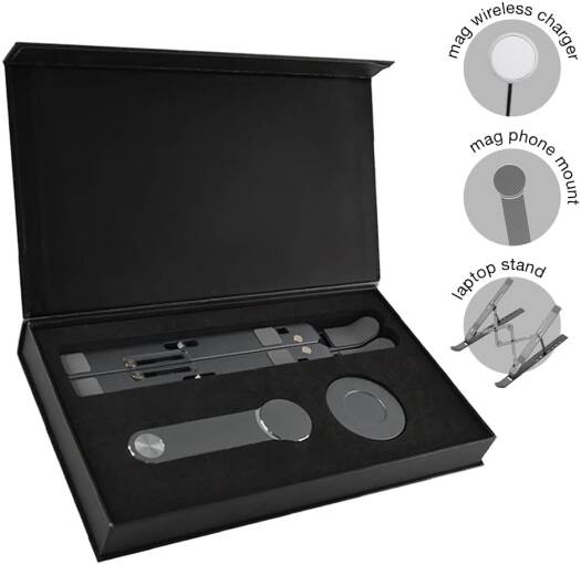 This 3-in-1 kit consists of a metal phone or tablet mount for your laptop, a matching 15W universal magnetic wireless charger that can charge any wireless compatible smartphone and a laptop stand. You can now benefit by raising your laptop for better back and neck posture, while enjoying hands-free phone/tablet accessibility, convenient use of dual screens and fast universal wireless charging – all at the same time. This kit will help boost your productivity while working, studying, or on the go.