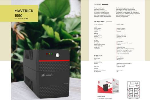 Line Interactive UPS topology includes technology that enables the UPS to interact with incoming AC voltage and correct minor voltage fluctuations without switching to battery. This extends the life of the battery and is essential in areas where frequent power fluctuations are common. The MercuryUPS 1550VA Maverick Line Interactive UPS ideal for Personal Computers and Electrical Equipment. Protects from damage, downtime, and data loss. Features: Power-on self-test Sinewave Sinewave Humanized Alarm System Off mode charging function Optional no-load shutdown Built-in self-diagnostic function Intelligent battery management Excellent microprocessor control Auto restart while AC is recovering Comprehensive and reliable protection Boost and buck AVR for voltage stabilization Built-in super-fast charger shorten charging time