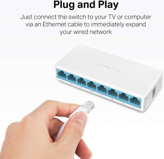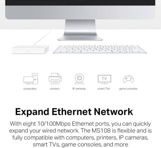 Eight 10/100Mbps auto-negotiation RJ45 ports with auto MDI / MDIX supported.Easily wired network expansion.Compact design for flexible arrangement.Plug and play setup, no configuration required