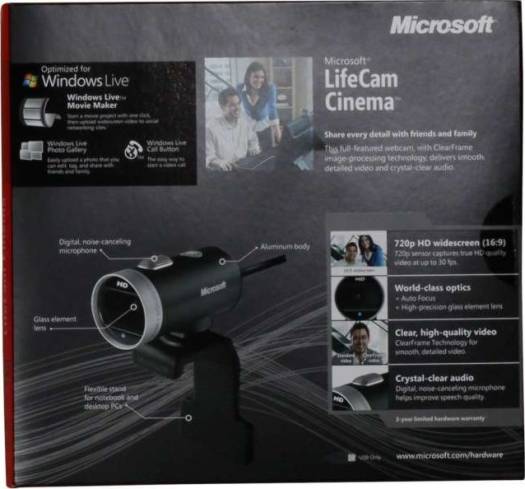 720p HD widescreen: 720p sensor captures true HD quality video at up to 30 fps. Auto Focus: Images stay sharp and detailed even during close-ups. High-precision glass element lens:High quality lens delivers more accurate colors and sharper video. ClearFrame Technology: ClearFrame image-processing technology delivers smooth, detailed video, even in low light conditions. Digital Microphone: Digital microphone with noise cancelling technology helps improve speech quality for crystal clear audio. TrueColor Technology:Automatically controls exposure for bright and colorful video. Windows Live Movie Maker: Start a movie project with one click, then upload widescreen video to social networking sites. LifeCam Cinema HD Capture and Share it All in Glorious HD Don’t miss a thing-enjoy high-quality 720p HD widescreen video together with crystal clear audio, with the LifeCam Cinema. Relax while the camera automatically sharpens