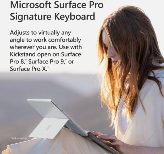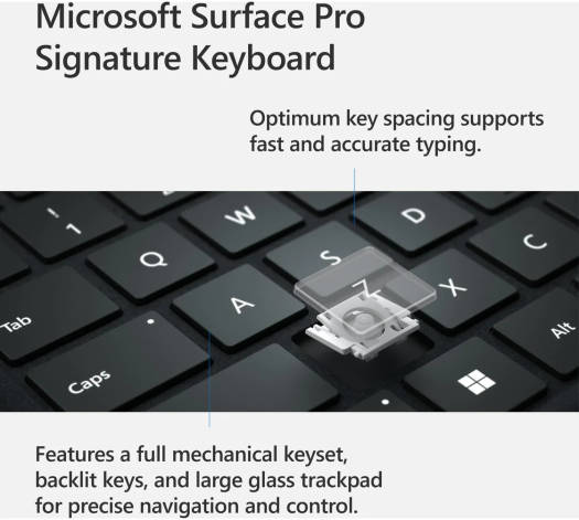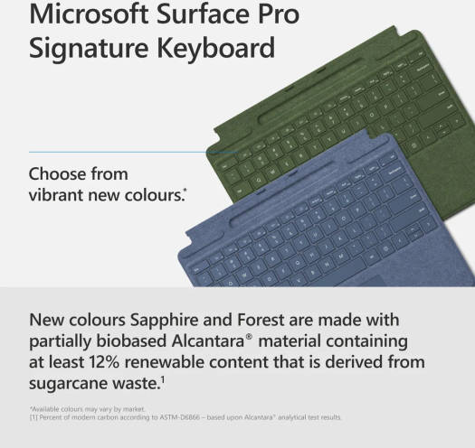 Next-level versatility comes in the perfect, premium keyboard, featuring a large glass trackpad and luxurious, Alcantara material covering. Ready to pair with Surface Pro 9, Surface Pro 8, and Surface Pro X. Transform Surface Pro 9* into a full laptop Designed for Surface Pro 9, Surface Pro 8, or Surface Pro X* Full mechanical keyset, backlit keys, and large touchpad Work your way anywhere Microsoft Surface Pro Signature Keyboard clicks into place instantly and stays securely attached. Features an exceptionally responsive design for fast and accurate typing, with backlit keys, and a large multi-touch glass touchpad. Introducing partially biobased Alcantara® New Sapphire and Forest1 Signature Keyboards are made with partially biobased Alcantara® material containing at least 12% renewable content2 derived from sugarcane waste. A touc