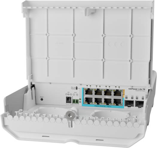 Mikrotik Net Power Lite 7R Outdoor Reverse PoE Switch, With Gigabit Ethernet and 10G SFP+ Ports, 29 W Power Consumption, 8 10/100/1000 Ethernet Ports, White | CSS610-1Gi-7R-2S+OUT