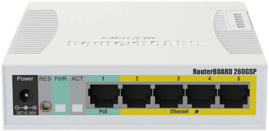 Specifications Product code CSS106-1G-4P-1S Switch chip model QCA8337 Dimensions 113x139x28mm Operating System MikroTik SwOS