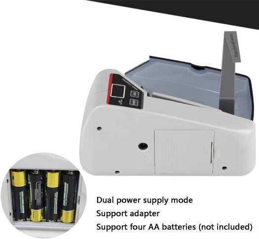The portable mini money counter with counting function only,and with compact design, easy to use and carry. This money counting machine is suitable for most paper currencies in the world.It is great tool for small counting. ¸This money counting machine counts the quantity of bills only,not the sum of money. Specifications: Display Screen: LED 3 Digits Power Supply: AC100-240V 50-60Hz; 4 * AA Batteries (not included) Power Consumption: 2W Size: 75*190*120mm Products include: 1 * Money Counter Machine