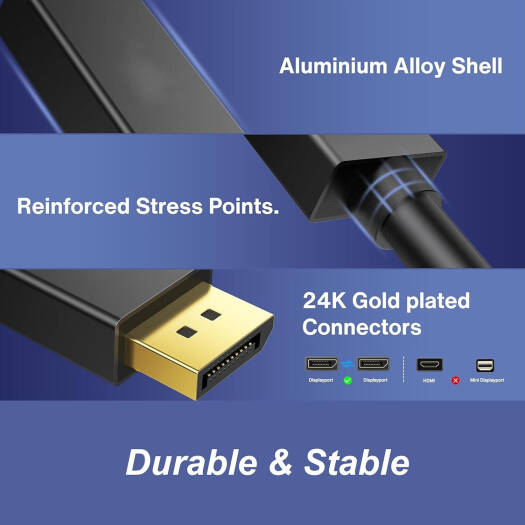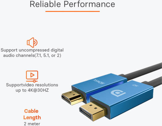 Connect DisplayPort-equipped computers/devices to HDMI-enabled televisions Monitor resolution support 4Kx2K @60Hz , 1440p@144Hz, and HDTV resolution support up to 1080p Make HDMI to displayport connections without an adapter. Supports both Audio and Video. Nothing to install just plug and play Plug and play: Easily connect your HDMI Port-enabled devices to Ultra HD TVs and monitors with this HDMI to DisplayPort Cable. Connectors: 24K Gold-plated connectors Audio: transmits high-definition video and audio from your computer to an HDTV for video streaming or gaming Resolution support: esolution support 4Kx2K @60Hz , 1440p@144Hz, and HDTV resolution support up to 1080p. digital channels (7.1,5.1 or 2) HDMI Input – DP Out Put 2 Meter