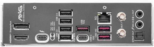 | Back Panel Ports | DisplayPort, HDMI, USB 2.0, USB 10Gbps (Type-A & Type-C), 5G LAN, Wi-Fi/Bluetooth, Thunderbolt™ 4, Flash BIOS Button, Clear CMOS Button, S/PDIF-OUT, Audio connectors |