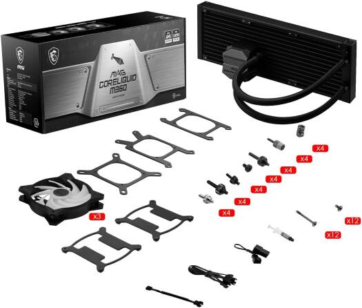 MAG CORELIQUID M360 Constructed with three layers of netted plastic tubing and a reinforced mesh exterior. The unique curved copper plate is designed to fully cover the CPU while offering rapid heat dissipation. Constructed with three layers of netted plastic tubing and a reinforced mesh exterior. The radiator has a 12 pathway designed to help rapidly dissipate heat. Compatible Sockets & CPU: Intel Socket LGA 1150, 1151, 1155, 1156, LGA1200, 1700, LGA2011, LGA2011-3, LGA2066 / AMD Socket AM5, AM4, TR4 Specifications: RADIATOR SIZE 360 mm