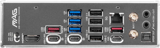 | Back Panel Ports | Clear CMOS, USB 10Gbps Type-A & Type-C, USB 5Gbps, USB 2.0, 5G LAN, Wi-Fi, Audio, Flash BIOS, HDMI™, USB 40Gbps Type-C |