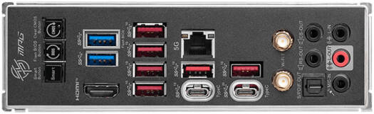 | BACK PANEL PORTS | Flash BIOS / Clear CMOS, USB 5Gbps (Type-A), USB 10Gbps (Type-A), 5G LAN, Wi-Fi / Bluetooth, Audio Connectors, Smart Button, HDMI™, USB 10Gbps (Type-C), USB 20Gbps (Type-C), Optical S/PDIF Out |