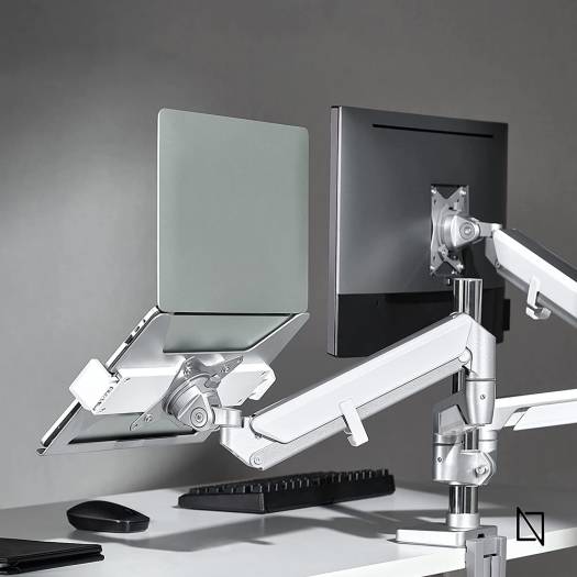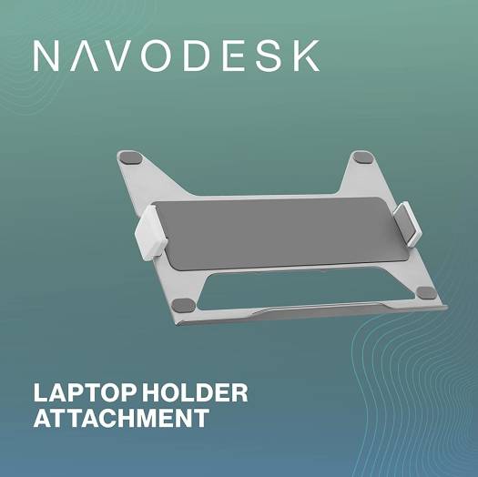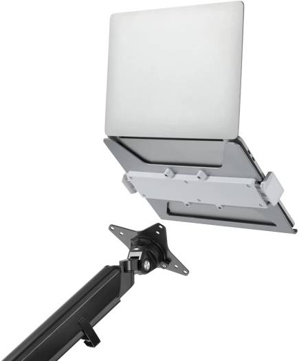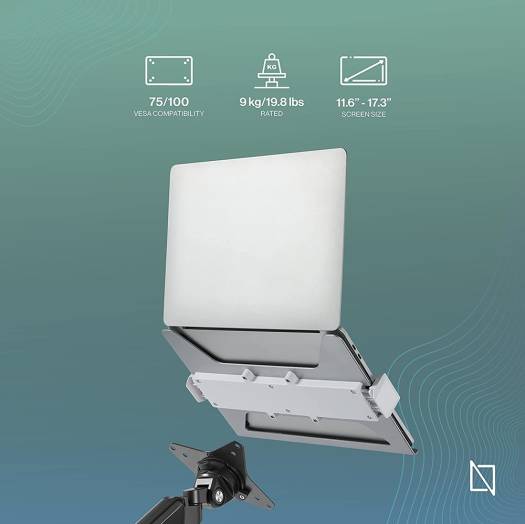 Navodesk Universal Laptop Holder Attachment For Monitor Arms – Universal holder fits 11.6″-17.3″ laptops up to 9 kg (19.8lbs). – Compatible with 75X75 VESA patterns. – Anodized aluminum for a sleek and stylish look. – Two adjustable claws with silicone pads firmly hold the laptop. – Ventilated design improves airflow to prevent overheating.