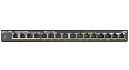NetGear 16-Port Gigabit Ethernet PoE+ Switch, 115W Power, 32 Gb/s Capacity, 802.1p QoS, Auto-MDI/MDIX, Fanless Design | GS316P