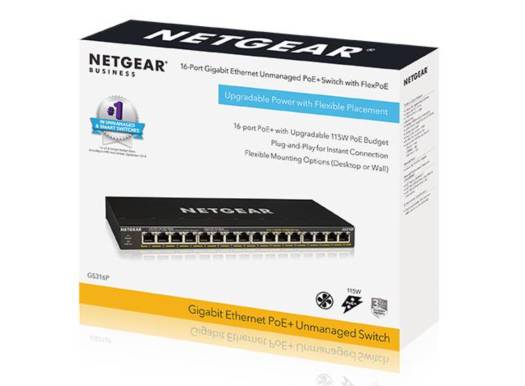 16 PoE+ ports with 115W power budget. Unmanaged 300-Series PoE Switches are easy, reliable, and affordable network connectivity for home and small offices. Providing power and data from a single Ethernet cable. ETHERNET PORT CONFIGURATION: 16 Gigabit ports PLUG-AND-PLAY: Simple set up with no software to install or configuration needed and zero maintenance FULL PERFORMANCE: Non-blocking switching architecture for maximum throughput at wire speed