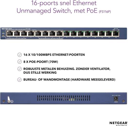 NETGEAR FS116P ProSafe 16-port 10/100 Desktop Switch The ProSafe FS116P provides power and data from a single point, using Power over Ethernet (PoE) over a single Cat-5 cable. The sixteen Fast Ethernet ports can be used for any 10/100 Mbps link and eight of these ports can supply industry-standard IEEE 802.3af power. Advanced auto-sensing algorithm gives power only to 802.3af end devices, so no need to worry about damaging proprietary PoE or non-PoE equipment. In addition, it discontinues the power when PoE devices are disconnected. Easy and reliable, the ProSafe FS116P automatically determines PoE requirements, speed, duplex, and cable type using AutoUplink™. The affordably priced ProSafe FS116P delivers PoE to any small business network that wants to simplify the installation of wireless access points and IP-based surveillance cameras. These devices are optimally installed on a ceiling or high on a wall, away from most electrical outlets. PoE eliminates the requirement for a dedicated electrical outlet to power these devices. This allows for flexibility in situating devices where AC power is difficult to access and lowers installation costs. Compact and flexible, the ProSafe FS116P is ideal for small business network that want to inexpensively use PoE to deploy wireless access points and IP-based network surv