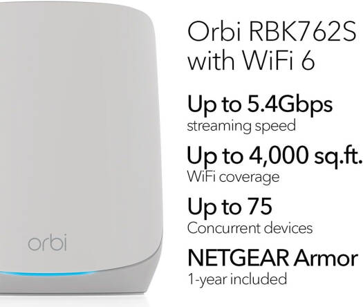Orbi RBK762S – 2 Pack AX5400 WiFi Mesh System Upgrade to blazing-fast 5.4Gbps of WiFi 6 on up to 75 devices simultaneously across more space: 5 rooms or up to 5,000 sq. ft. The RBK762S includes a dedicated connection for instant router-satellite communication so WiFi speed stays fast as more devices connected, and 5 Gigabit ports to give your most demanding tech products their own wired connection. Keep your family and your connected devices safe from online threats with 1 year of NETGEAR Armor all-in-one internet security. Key Features Coverage up to 5,000 sq. ft. and for up to 75 devices. Extend coverage up to 2,500 sq. ft. with each additional satellite (sold separately) Fast AX5400 Gigabit speed with WiFi 6 technology for uninterrupted streaming, HD video gaming, and web conferencing
