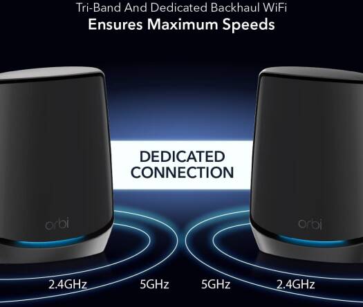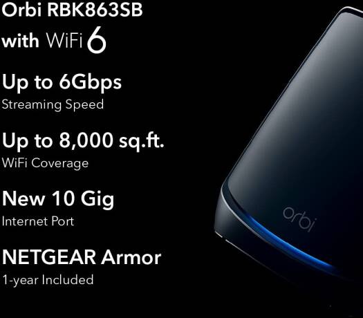 RBK863SB Tri-Band WiFi 6 Mesh System Elevate your internet experience to high-performance, whole-home WiFi with NETGEAR® Orbi™ RBK863S. This Tri-BandMesh WiFi System sends ultrafast speeds up to 6Gbps across up to 8,000 square feet—even to your front and backyards. Upgraded, patented antenna design boosts your WiFi coverage even further t