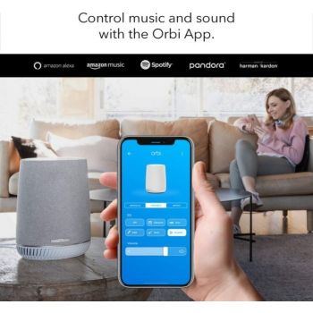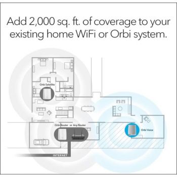 Smart Speaker. Smarter Wi-Fi Orbi Mesh Wi-Fi Add-on Satellite with Orbi Voice delivers whole-home Wi-Fi with a built-in smart speaker experience. Tri-band Mesh Wi-Fi brings high-performance Wi-Fi throughout your home and extends your existing Wi-Fi for less buffering and dead zones. Add-on Satellite for high-performance whole-home Wi-Fi coverage — Add on to your existing Orbi Wi-Fi System to add up to 2,000 sq. ft. of Wi-Fi coverage Built-in Alexa voice control — Voice control your music and your smart home. Enjoy all he
