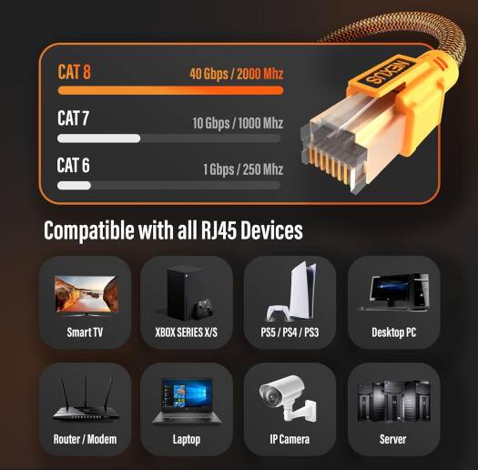 NEXUS CAT8 Network Cable 2M FULL COPPER Ethernet Cable High-Speed 40Gbps 2000MHz RJ45 Braided and Shielded Ethernet Cable Compatible with Ethernet Switches PS5 PC Router TV Xbox, 2M