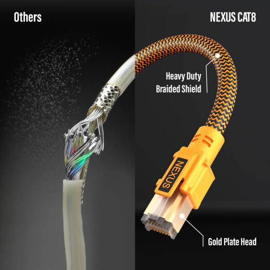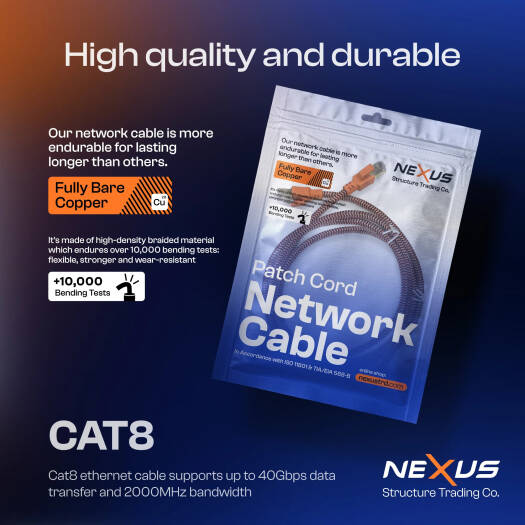 CAT8 Nexus CAT8 cables are the ideal solution for most of today’s network requirements. They are manufactured and tested to the latest Category 8 specifications defined in the International and American cable standards and are designed to meet the quality and performance criteria needed to support all applications up to 2000 MHz. Performance Fully bare Copper cables are long lasting cables comparing the CCAM cables . CAT8 ethernet cable speed can transmit 2 billion signals per second. And a CAT8 data transfer rate can be 250-400 times faster than CAT5. From the table, you can see how CAT8 is significantly more powerful than even the CAT7. Its performance is substantially greater, making it very attractive to large enterprises and driving high demand. Besides fiber-optics, CAT8 cable is a viable solution for supporting data center networks.