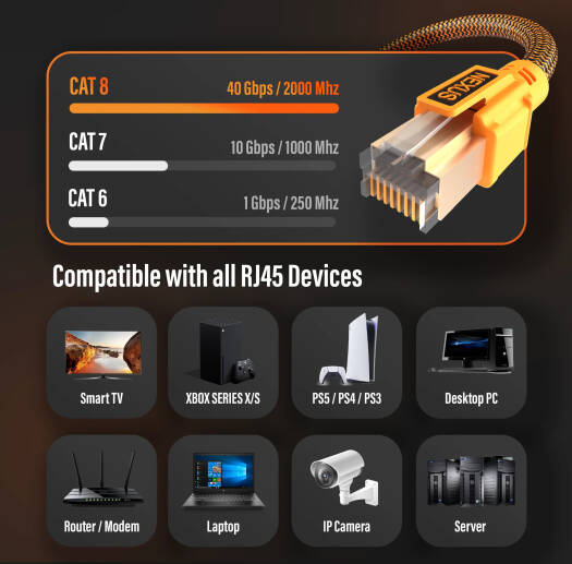 Nexus CAT8 SFTP Network Cable, 40 Gbps Transmission Speed, 2000Mhz Frequency, Full Bare Copper Conductor 23AWG, Weather Proof PVC Jacket, Braid Shield, 20M Cable Length, Black/Orange | 20MCAT8
