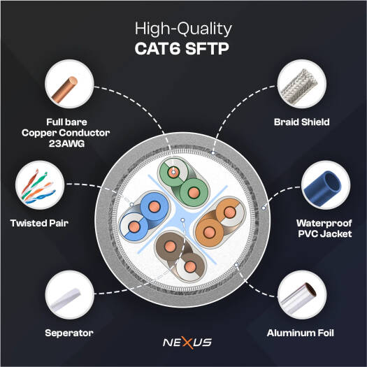 Patch Cord CAT6-A Network Cable (SFTP) Nexus CAT6 cables are the ideal solution for most of today’s network requirements in normal office environments. They are manufactured and tested to the latest Category 6 specifications defined in the International and American cable standards and are designed to meet the quality and performance criteria needed to support all applications up to 250 MHz.