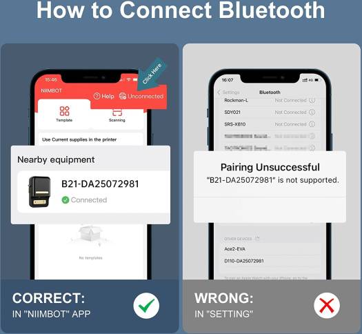 Inkless, Fast Printing- B21 inkless label maker never needs ink, prints labels at the speed of 2.4”/s (60mm/s), Keep your life organized and efficient. NIIMBOT B21 thermal label maker can auto recognition, auto alignment label paper, Our eco-friendly thermal paper, it’s printing solutions for product labels, address labels, price labels, clothing labels. Powerful & Wireless – NIIMBOT B21 Bluetooth label maker can auto identify the label paper. 4 hours continuous working time after 1.5 hours charging. Our free NIIMBOT APP have functions like scan, image recognition, batch printing, serial number are offered, 20+ fonts, 1000+ emojis, 100+ borders are provided for custom label designs. Easy to Use – B21 bluetooth label printer compatible with iOS & Android. Using App: Install NIIMBOT App from App Store & Google Play, Turn on B21 label printer and open bluetooth connection. Choosing and connecting printer model B21 from NIIMBOT APP, Then Enjoy Printing. Multifunctio