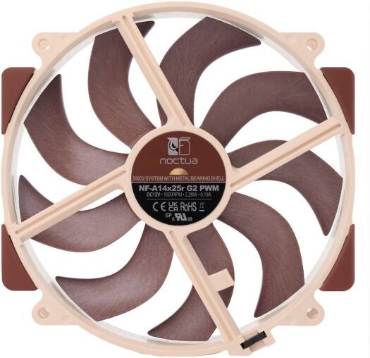 NF-A14X25r G2 PWM Succeeding the award-winning NF-A15 and building on the technological innovations of the ground-breaking NF-A12x25, the NF-A14x25r G2 is Noctua’s next-generation round-frame 140mm flagship model: Made from Sterrox® LCP, its highly optimised Progressive-Bend impeller with winglets, Flow Acceleration Channels and Centrifugal Turbulator hub combined with a tip-clearance of only 0.7mm allow the NF-A14x25r G2 to further improve its predecessor’s renowned quiet cooling performance. This makes it not only a perfect fit for Noctua’s next-generation 140mm class heatsinks but also an excellent upgrade for existing cooler models such as the NH-D15(S) or NH-U14S series (Sx2-PP set recommended for push/pull configurations). The 4-pin PWM version supports fully automatic speed control via PWM fan headers and comes with a Low-Noise Adaptor to reduce the maximum speed from 1500 to 1250rpm. Its ultra low-loss etaPERF™ motor with Smooth Commutation Drive 2 technology doesn’t only provide unprecedented energy efficiency and running smoothness but thanks to the new SupraTorque™ feature, it can also leverage extra torque headroom to keep the fan at its desired speed when working against back pressure, thereby ensuring even better performance on heatsinks. Topped off with Noctua&rsqu
