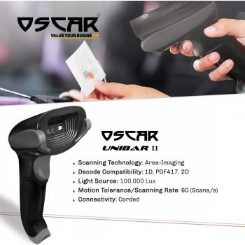 Oscar UniBar II 1D QR 2D Barcode Scanner Reader Automatic Area Imager USB + Virual COM Wired With Stand Scans QR Code From Mobile Phone Android, iOS, MacOS, Windows Super Highspeed | MBSOSC87800UB