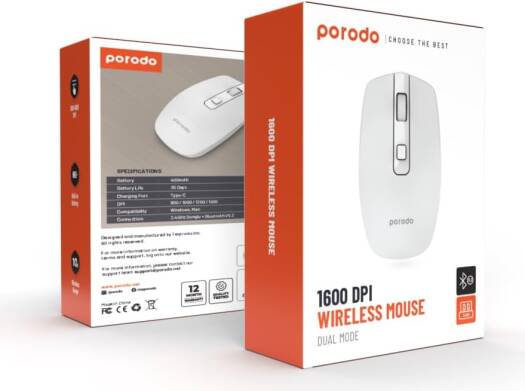 Porodo 2.4G Wireless and Bluetooth Rechargeable Moue DPI 1600 – White
