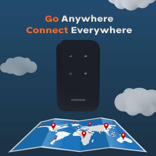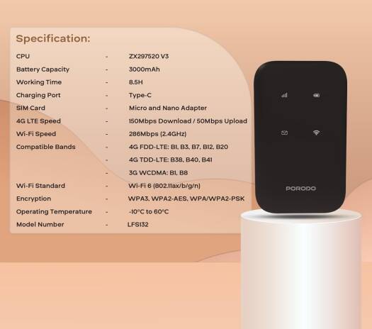 Porodo 4G LTE Pocket Router with Wi-Fi 6, 3000mAh Rechargable Battery, Supports 10 Devices, Secure Encryption, Up to 150Mbps Download Speed, Type-C Ch