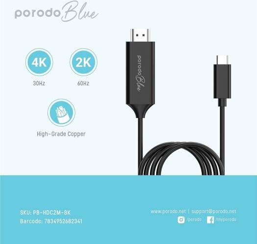 Porodo Blue Type-C to HDMI Ultra HD Cable (2m)The Porodo Blue Type-C to HDMI Ultra HD Cable is the perfect way to connect your laptop, tablet, or smartphone to your TV or monitor. With support for 4K (30Hz) and 2K (60Hz) resolutions, you can enjoy stunning visuals on your big screen. The cable is made with high-grade copper, ensuring that you get the best possible picture quality.Supports 4K (30Hz) and 2K (60Hz) resolutionsMade with high-grade copper2m lengthDurable and reliableEnjoy stunning visuals on your big screenGet the best possible picture qualityConnect your devices easily and securely Connector Type-C to HDMI Resolution 4K (30Hz) / 2K (60Hz) Cable Length 2m Material High-grade copper Connect the Type-C connector to your device's Type-C port.Connect the HDMI connector to your TV or monitor's HDMI port.Switch the input source on your TV or monitor to the HDMI port that you are using.The Porodo Blue Type-C to HDMI Ultra HD Cable is backed by a 12-month warranty. If you are not satisfied with your purchase for any reason, you can return it for a full refund.Order your Porodo Blue Type-C to HDMI Ultra HD Cable today and experience the difference!