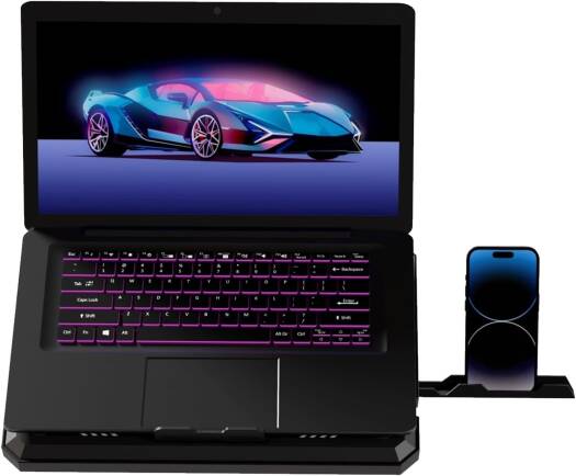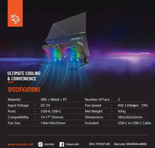 Porodo Gaming Crystal Shell Laptop Cooling Pad With Phone Holder, Dual High-Speed Fans, 8-Level Adjustable Height, RGB Lighting, Anti-Slip Base, USB-A & USB-C Ports, Compatible with 10-17 Laptops