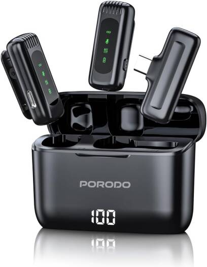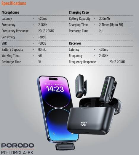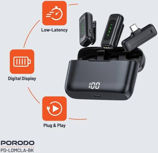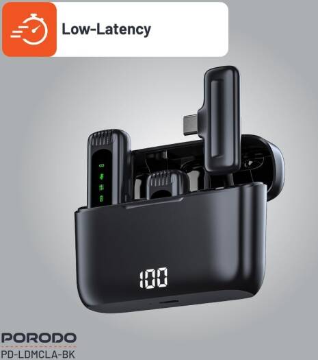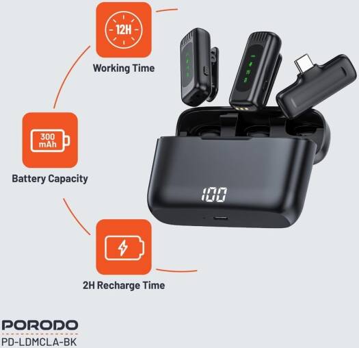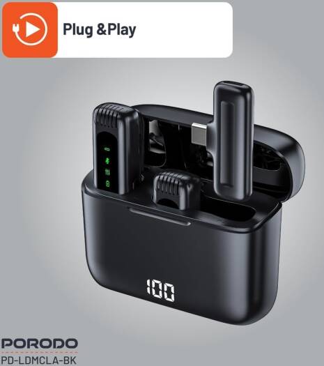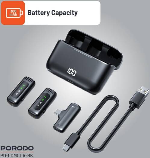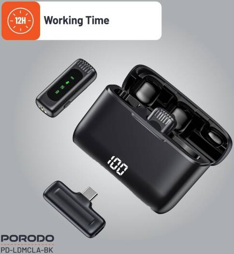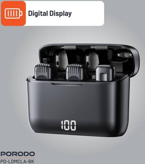Porodo Lavalier Double Microphone With Charging Case,12H Working Time,Low-Latency,Digital Display,Plug & Play,Type-C Connector With Lightning Head Adapter,Durable Material – Black