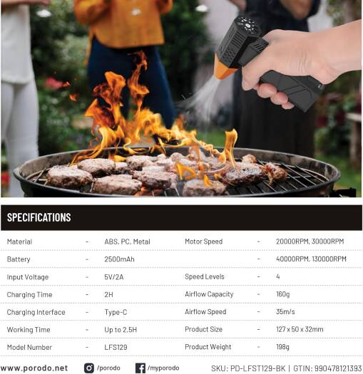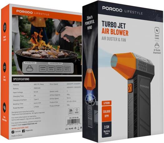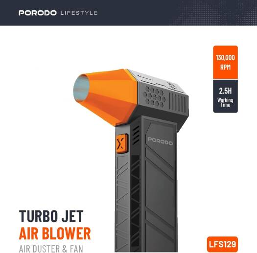 Porodo Lifestyle Turbo Jet Air Blower, 2500mAh Battery, 35m/s Airflow Speed, 4 Speed Levels, Magnetic Air Nozzle, Strong Brushless Motor, Type-C Charging Interface, 2H Charging Time – Black