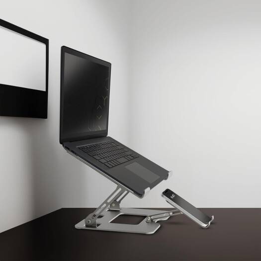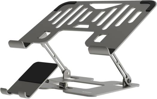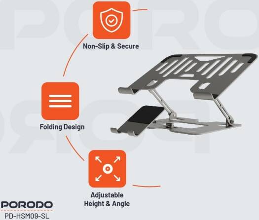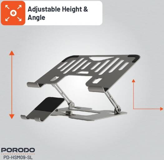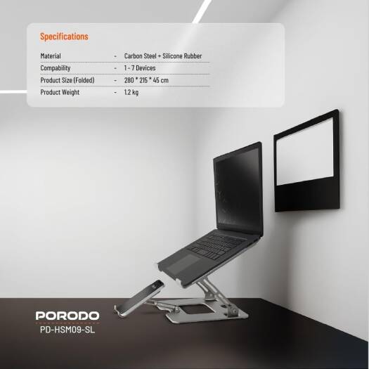 Porodo Smart Folding Multi-Device Stand With Phone Stand, Adjustable Height & Angle, Non-Slip & Secure, Sturdy & Portable, Compatible with 10″-17″ Laptops & Tablets – Silver