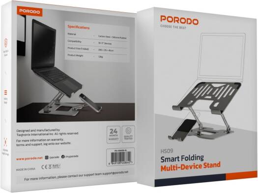 Elevate your workspace with the Porodo Smart Folding Multi-Device Stand, designed for ultimate convenience and ergonomic comfort. Crafted from durable carbon steel with silicone rubber padding, this stand provides a stable and non-slip surface for your devices. Its adjustable height and angle allow you to find the perfect viewing position, reducing strain on your neck and back. The foldable design makes it easy to carry and store, ensuring portability without compromising sturdiness. Compatible with devices ranging from 10 to 17 inches, this stand is ideal for laptops, tablets, and more. Whether you're working, watching, or gaming, this stand enhances your productivity while maintaining a sleek and modern look.