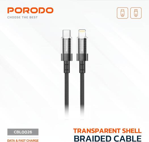 Porodo Transparent Shell USB-C To Lightning Head Cable, PD 30W, Universal Compatibility, Safe & Secure, Braided Wire, 1.2m Cable Length – Black
