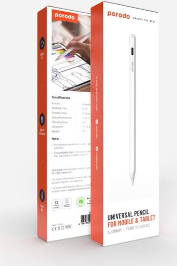 Explore the Porodo Universal Pencil, a versatile and precise tool designed to elevate your mobile and tablet experience. Crafted with an aluminum body and a magnetic surface, it exudes a sleek and modern look while providing a comfortable grip. With its 1.5mm nib, this pencil offers exceptional precision for drawing, note-taking, and navigating your devices. The magnetic attachment feature ensures secure storage when not in use. Thanks to the double-tap function, switching between tools and functions has never been more convenient. Enjoy extended productivity with an impressive 8-10 hours of active usage and an outstanding 30 days of standby time. When it's time to charge, the Type-C interface allows for swift recharging, taking only 1.5 hours to power up. Weighing just 16g, the Porodo Universal Pencil is lightweight and portable, making it an indispensable companion for your digital creativity and productivity needs.