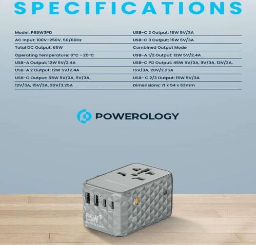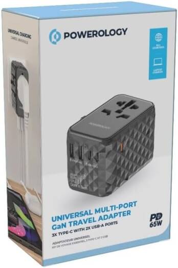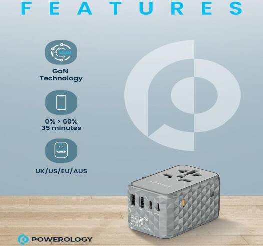 P65W3PD-GY Powerology Universal Multi-Port Travel Adapter with 2 USB-A, 3 USB Type-C ports, and EU/UK/US/AUS plug options is a universal compatible charging adapter which has the ability to charge multiple devices simultaneously. It supports PD65W Power Delivery Technology that charges your device from 0% to 60% in just 35 minutes and due to this rapid charge feature, it ensures fast charging for laptops and other devices. The GaN technology enables a compact, lightweight design, saving luggage space. The adapter’s versatility and high-quality build features make it a reliable choice. Standing out from traditional adapters, it offers a comprehensive charging solution, eliminating the need for multiple chargers. With its future-proof design, this GaN-based adapter sets a new standard for travel charging convenience.